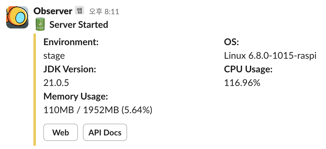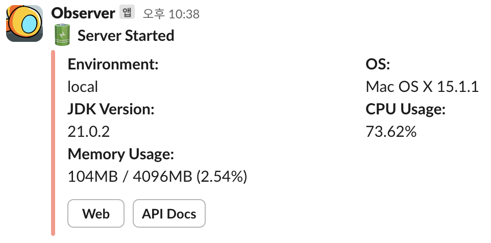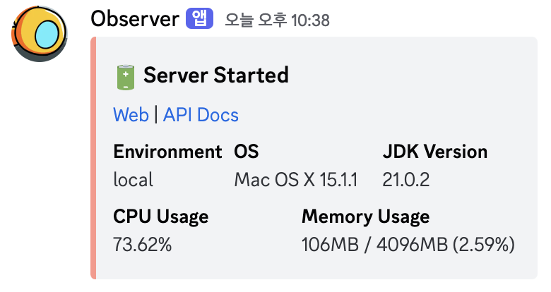 스프링 애플리케이션 시작 이벤트를 감지하여 알림 이벤트를 발생시키고, 웹훅 메시지가 정상적으로 전송되는지 확인합니다. 본 글에서 구현 코드를 다루지 않은 디스코드 발신자 또한 서버 시작 알림 발신자로 함께 등록하여, 동일 알림 유형에 여러 플랫폼이 등록된 경우에도 정상적으로 작동하는지 확인합니다.