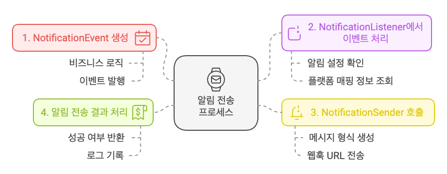 - `NotificationEvent`를 구독하고, 알림 설정 및 플랫폼 매핑 정보를 확인하고, 적절한 `NotificationSender`를 호출합니다.
