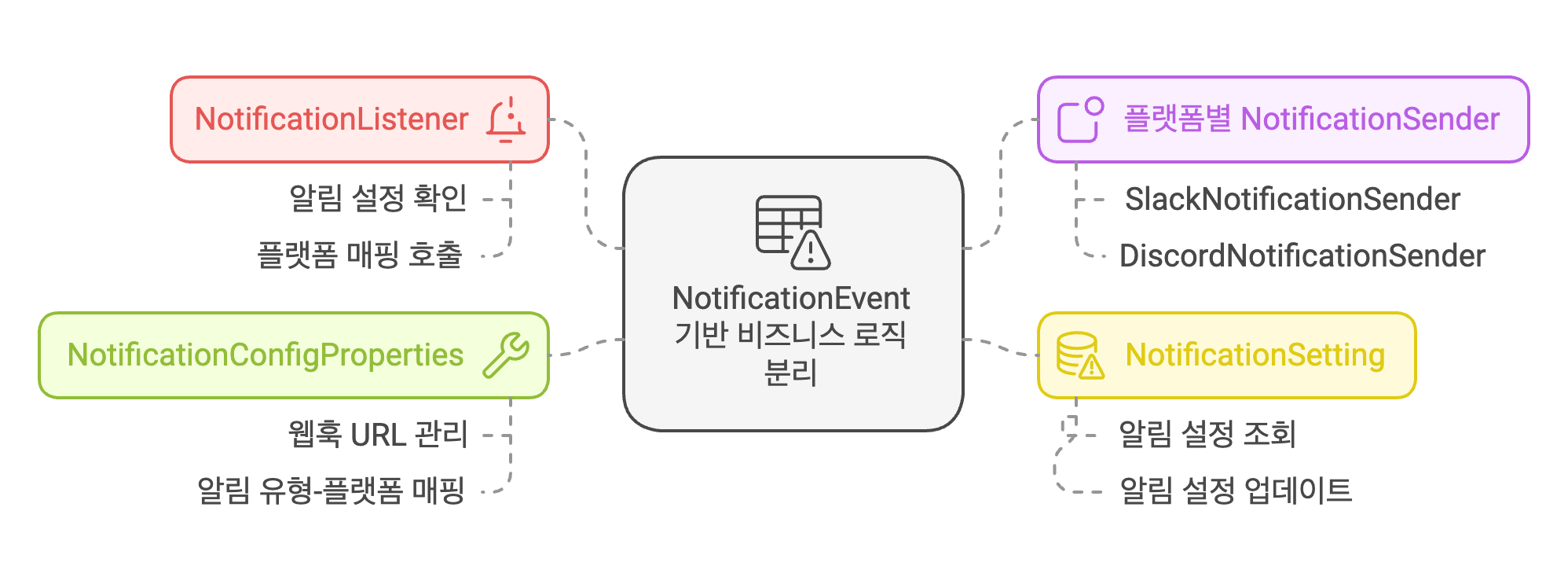 - 다수의 플랫폼을 지원하거나 알림 전달 방식을 확장하려면 기존 구조를 대폭 수정해야 하는 비효율성이 존재합니다.